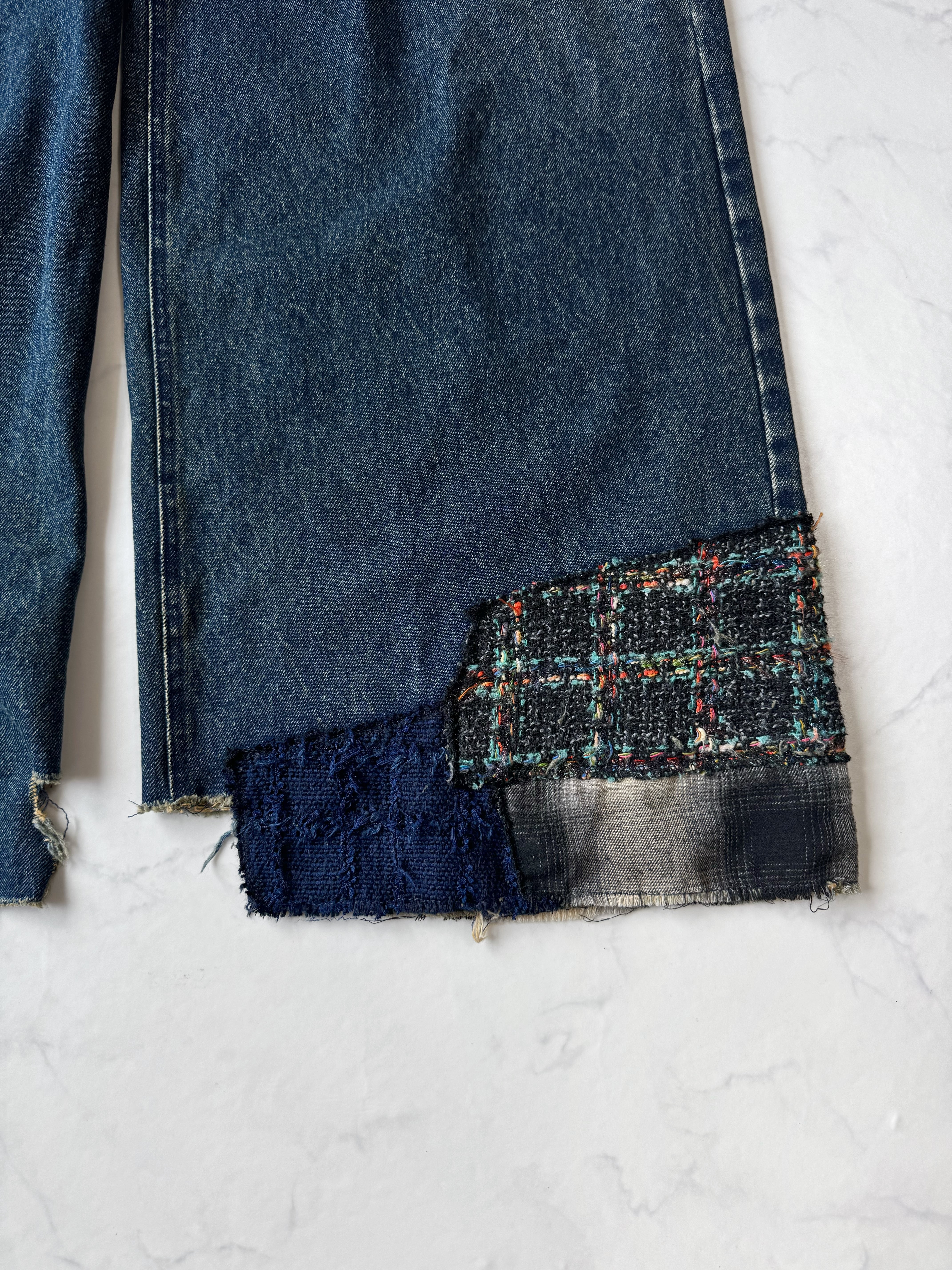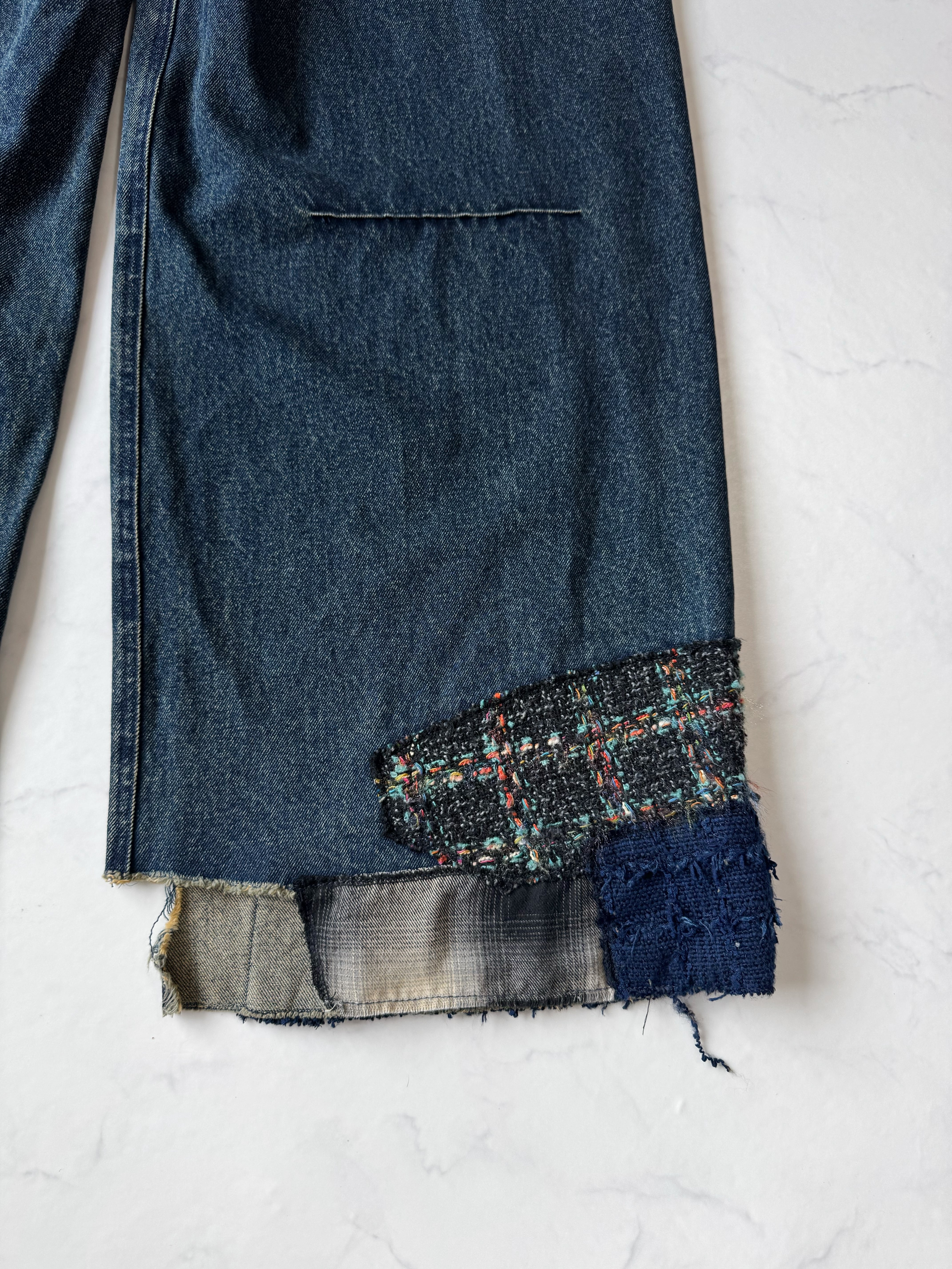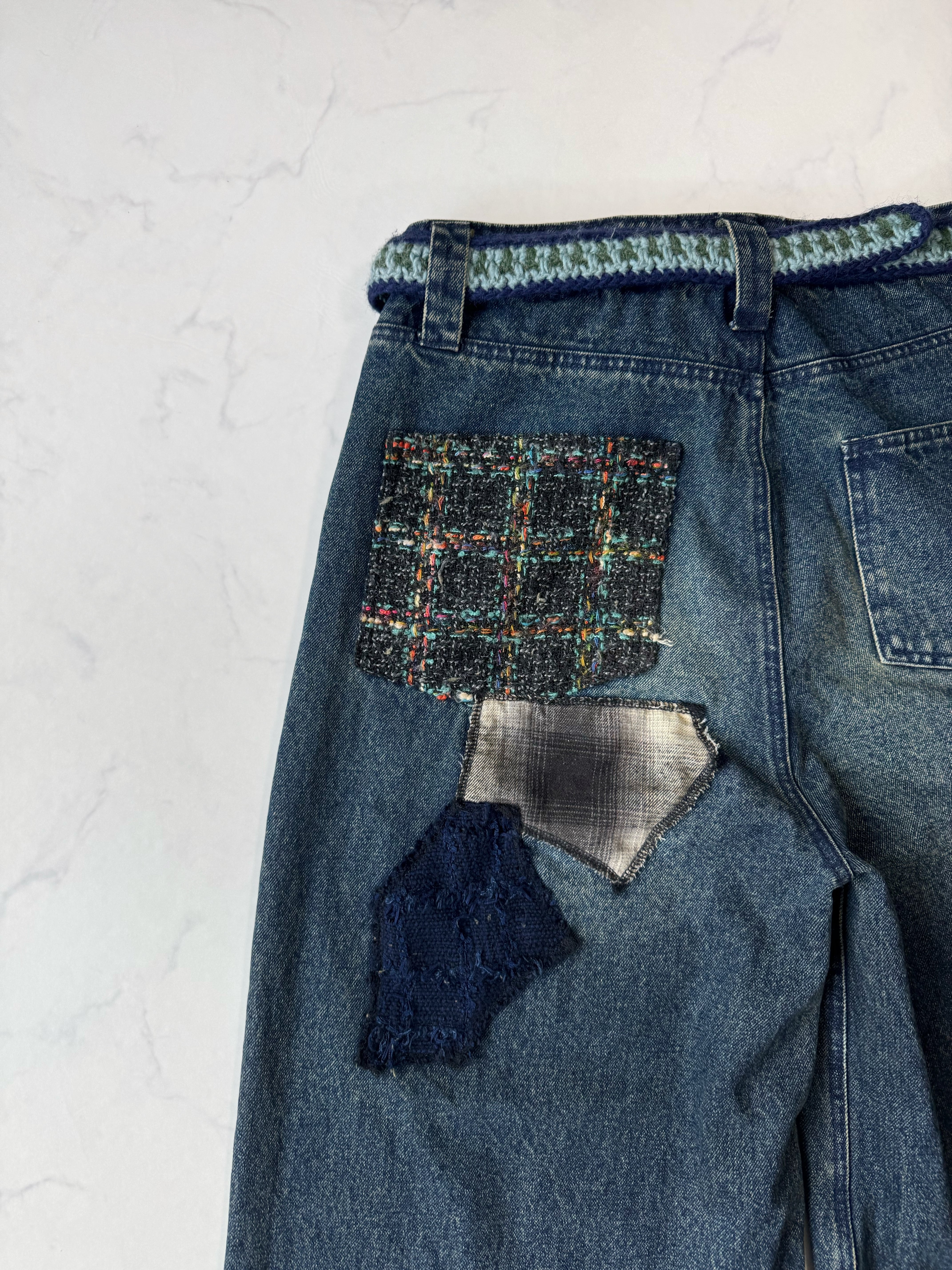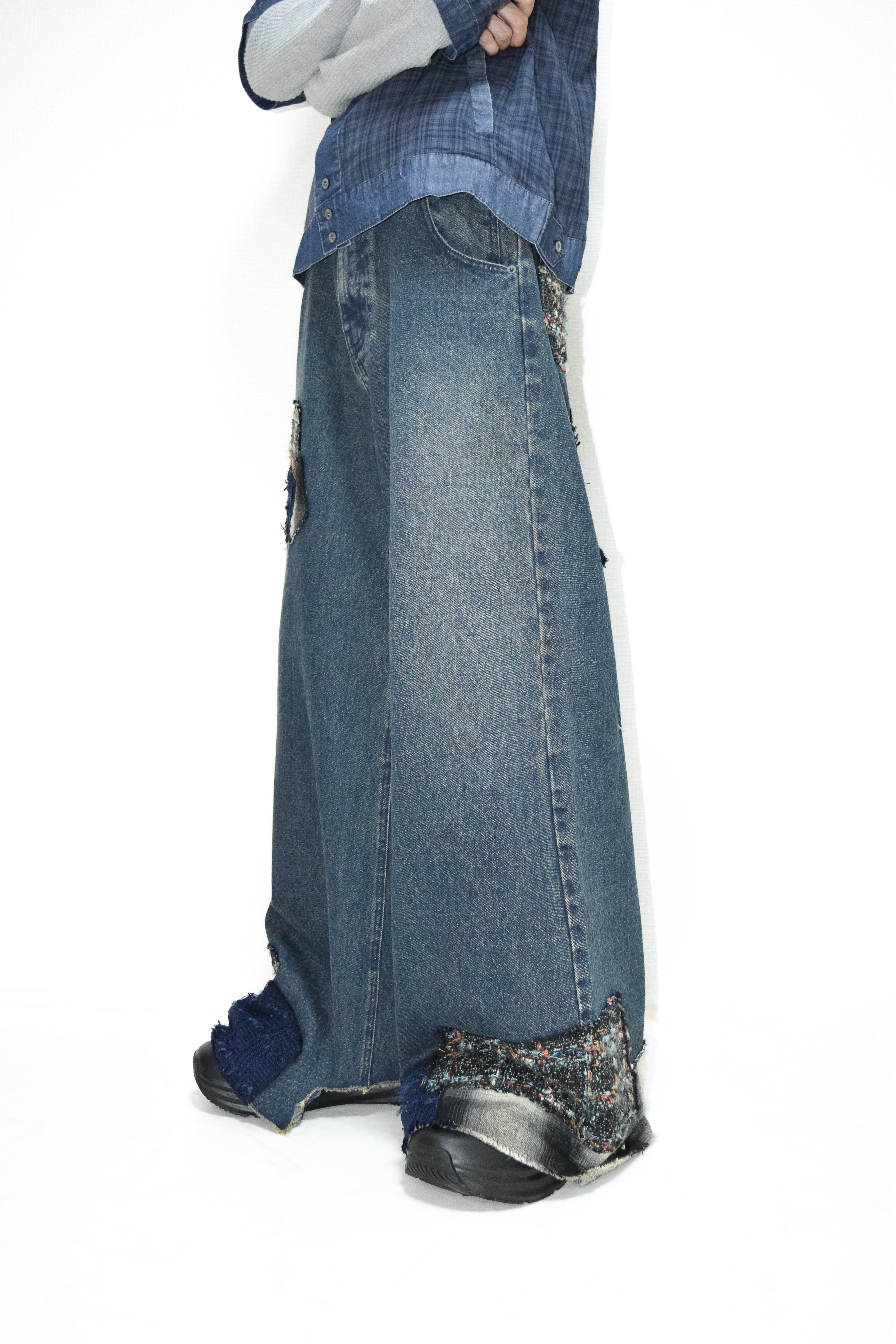 ・異素材がポケットや裾に叩きつけられたバギーデニムパンツ。