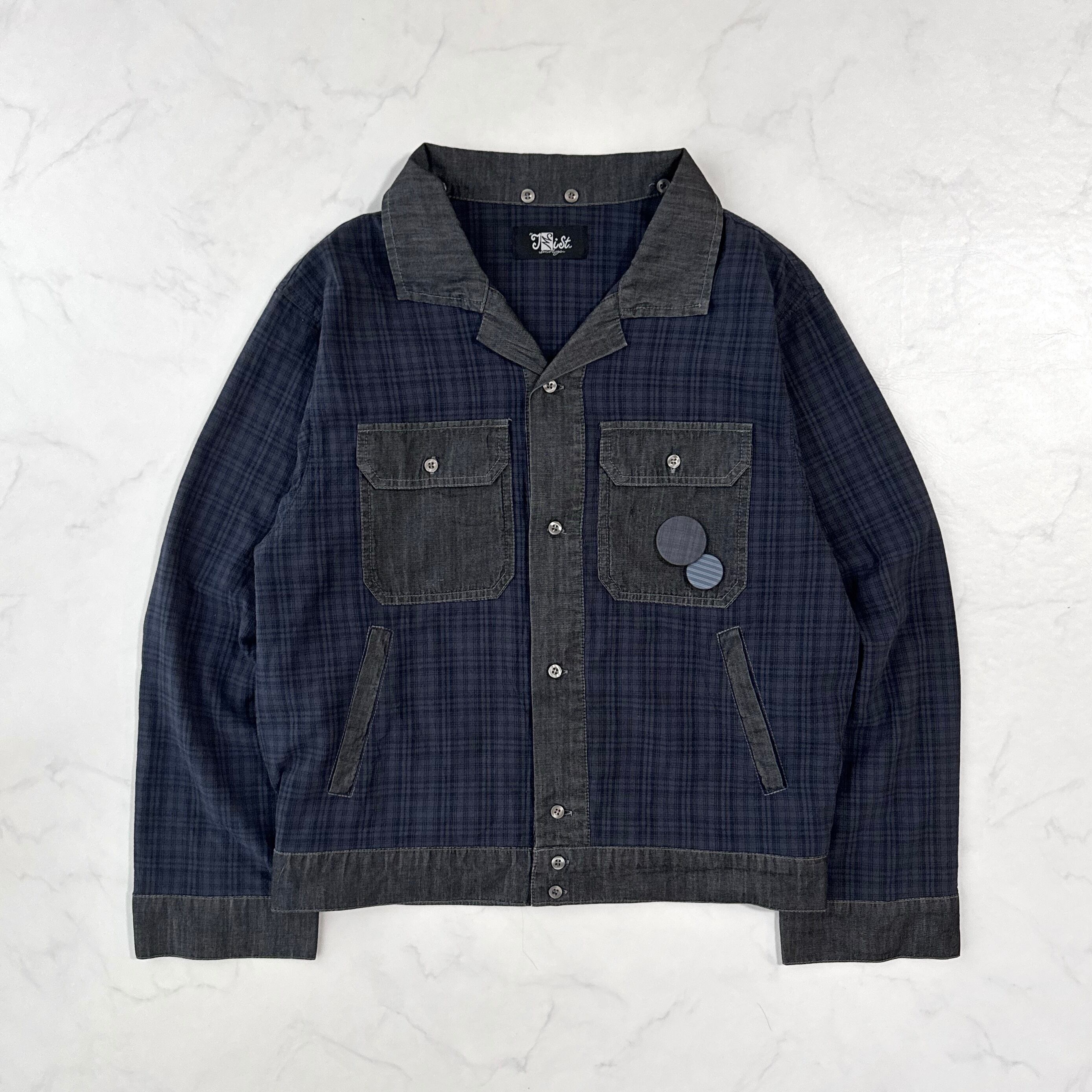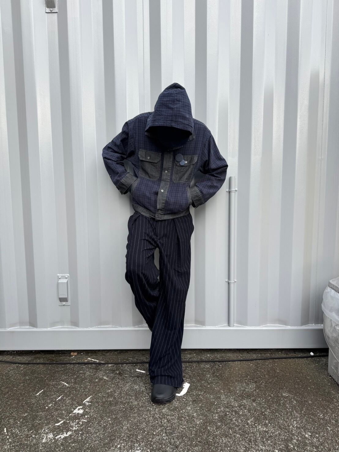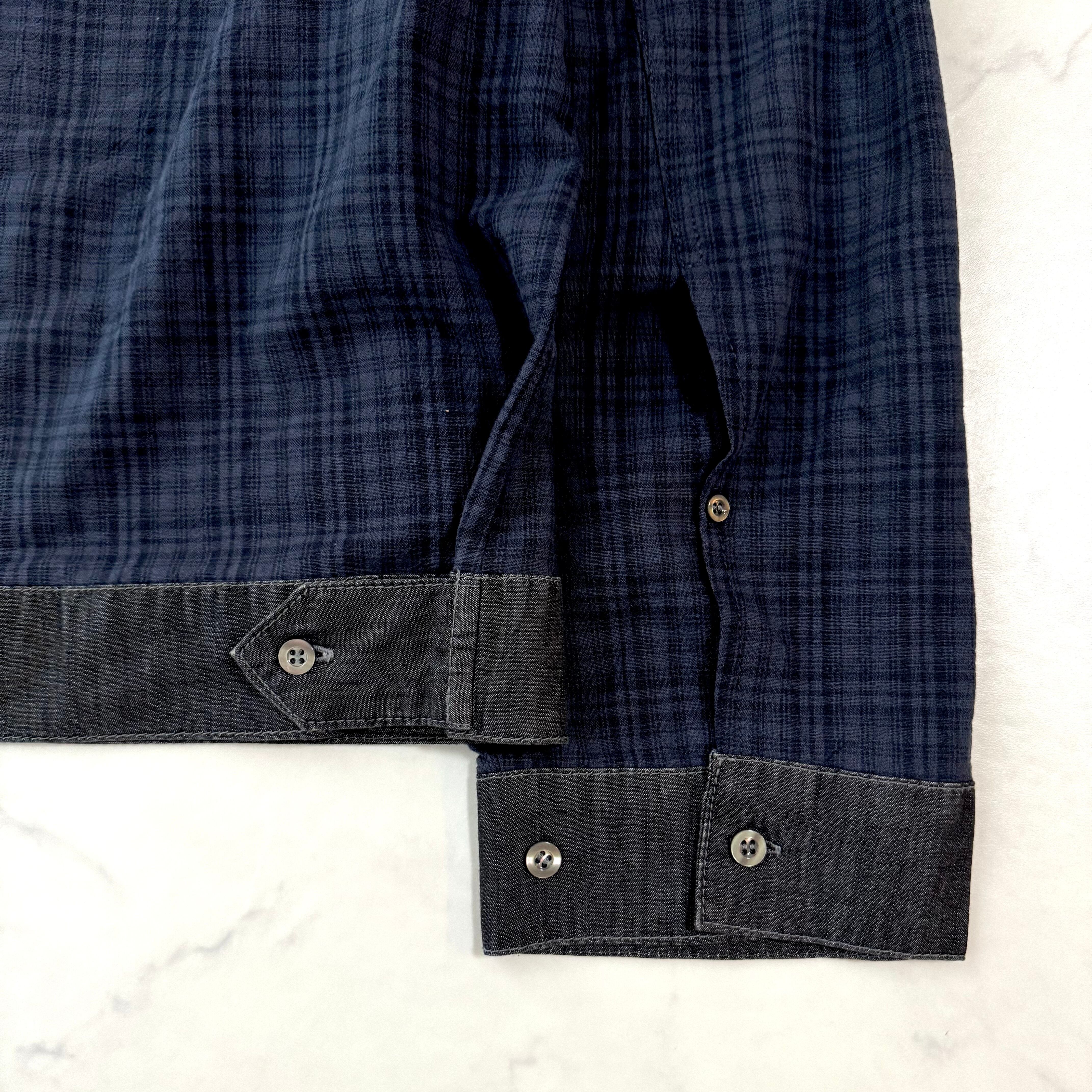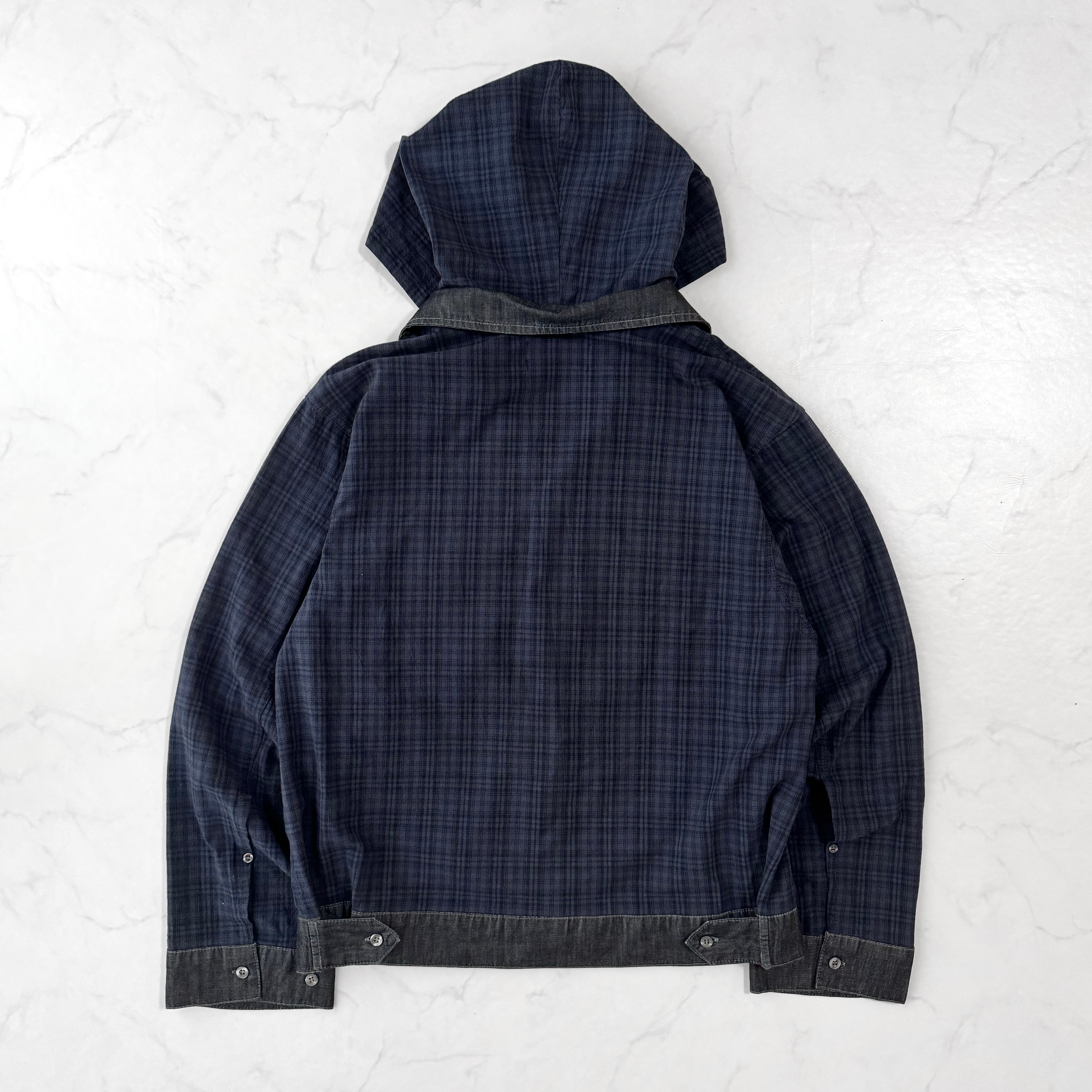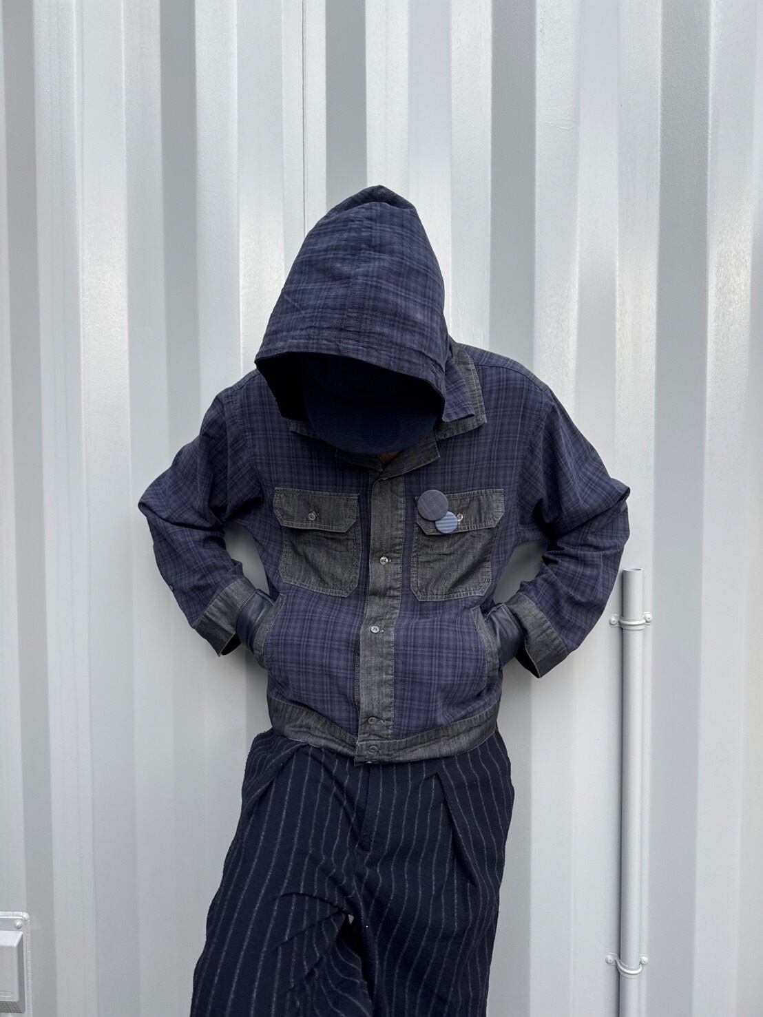 TΣist Blend Sheer Hooded Shirt Jacket "Denim x Plaid" / navy x gray